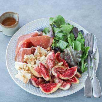 ③ 皿に葉物野菜をのせ、生ハム、ブリーチーズ、いちじくを盛り付ける。ブリーチーズといちじくにはちみつをかけて黒こしょうをふる。ブリーチーズの上には粗く刻んだくるみをトッピングし、全体にE.V.オリーブ油をかける。