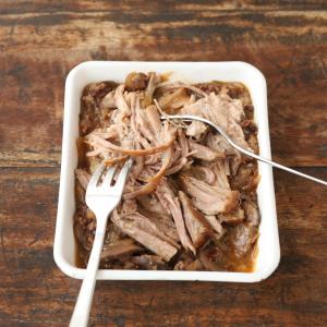 ④肉がほぐれるほど柔らかくなるまで、1時間半から2時間加熱する。煮汁部分は時々かき混ぜる。 煮汁部分の味をみて、足りなければ、塩、白こしょう(分量外)を加えて調える。 ⑤フォーク等で、肉の繊維に沿ってほぐしてからサンドイッチに使う。