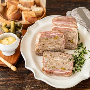 パテ・ド・カンパーニュは、テリーヌ型で作るフランスの田舎風パテで、本来は原料となる肉や内臓は豚のみを使用します。豚レバーが全体の3割ほど入るため、コクが深く、力強い風味が特徴です。ここでは、豚レバーを鶏レバーに替えることで、よりマイルドな味わいに仕上げました。網脂やベーコンで包むことで、肉の旨みが閉じ込められ、ジューシーに焼き上がります。